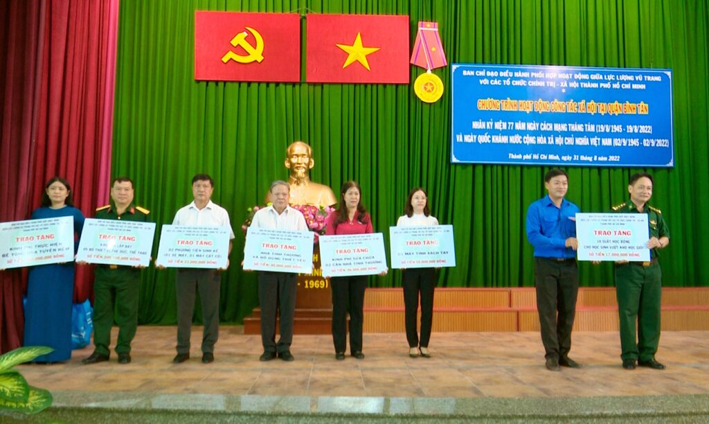 Ngày 31-8, Ban Chỉ đạo điều hành phối hợp hoạt động giữa lực lượng vũ trang với các tổ chức chính trị -xã hội Thành phố tổ chức hoạt công tác xã hội năm 2022 tại quận Bình Tân nhân kỷ niệm 77 năm Ngày Cách Mạng Tháng Tám (19/8/1945 – 19/8/2022) và Ngày Quốc khánh nước Cộng hòa Xã hội Chủ nghĩa Việt Nam (02/9/1945 – 02/9/2022).