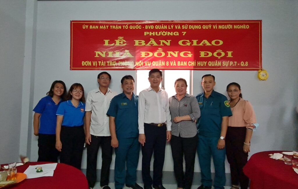 Tham dự tại lễ trao tặng “Nhà đồng đội” có ông Nguyễn Văn Cường – Quận ủy viên, Trưởng Phòng Nội vụ cùng mặt trận Tổ quốc Phường 7. Để thực hiện “Nhà đồng đội”, Mặt trận Tổ quốc phường 7 đã cùng với Phòng Nội vụ khảo sát, vận động đóng góp xây dựng căn nhà mới cho gia đình ông Mai Văn Minh tại địa chỉ số 2502 Phạm Thế Hiển là gia đình thuộc hộ nghèo. Gia đình ông Minh có 09 người, trong đó có 04 con trai tham gia nghĩa vụ quân sự và đã hoàn thành nhiệm vụ tại đơn vị và về với địa phương tham gia công tác, lao động trong xã hội.